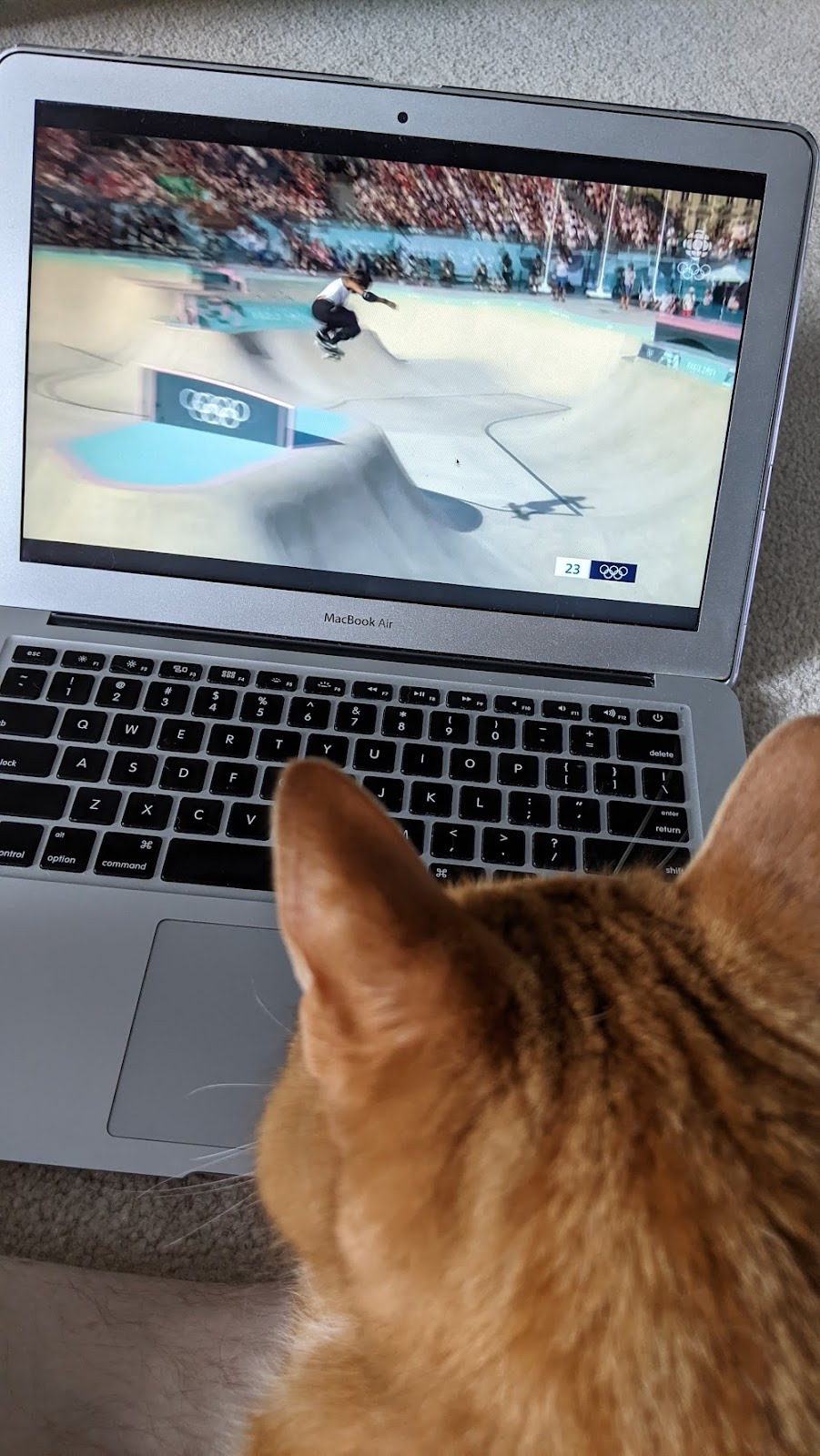 Marmalade (performatively) watching women’s park skateboarding at the Paris Olympics (2024)